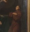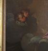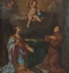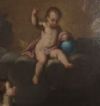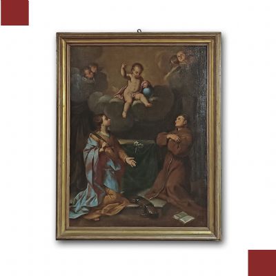 Raffinato dipinto ad olio su tela, impreziosito da una cornice in legno intagliato e dorato. Nel dipinto è raffigurata una scena di adorazione, con il bambino Gesù posizionato in alto, in posizione centrale, seminudo e seduto su delle nuvole. Gesù tiene una sfera blu in una mano, simbolo del dominio di Dio sul mondo, mentre con l’altra mano punta l’indice verso il cielo, ad indicare la sua natura divina. Ai lati della scena, sono rappresentate due coppie di angeli che assistono e partecipano all’evento. In basso, in adorazione e con lo sguardo rivolto verso Gesù, sono dipinti due santi in ginocchio: a sinistra Santa Caterina, che regge un ramo di palma, e a destra Sant’Antonio, raffigurato con la tunica da frate, con le mani incrociate sul petto e una corda legata a un frammento ligneo. Si tratta di un dipinto di grande gusto e raffinatezza, caratterizzato da una raffinata resa stilistica dei dettagli pittorici e da un sapiente uso del chiaroscuro, capace di conferire un tocco di eleganza e di antichità a qualsiasi ambiente. Manifattura ascrivibile alla scuola veneta dei primi del XVIII secolo.