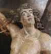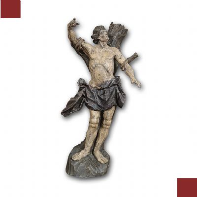 Elegante ed unica scultura in legno di cirmolo, finemente intagliata e dipinta. Il santo è raffigurato legato ad un tronco, che funge anche da supporto per la scultura. È rappresentato in piedi, con il petto scoperto, sul quale sono presenti delle frecce in legno, come nella iconografia tradizionale. Questa opera mette in risalto la raffinatezza stilistica dei dettagli, la delicatezza degli intagli e la perfezione delle pitture. Si tratta di una scultura dal grande gusto e raffinatezza, capace di aggiungere un tocco di classe ed antique a qualsiasi ambiente. Manifattura ascrivibile alla scuola veneta metà XVIII secolo.