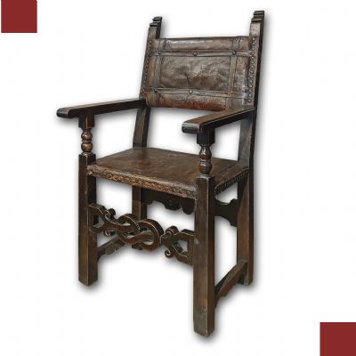Elegante poltrona in massello di noce intagliato, arricchita da parti in pelle originale sullo schienale e sulla seduta. Questa sedia, emblematicamente rappresentativa della tradizione toscana del Rinascimento, presenta gambe e braccioli dritti, mentre il sotto bracciolo è finemente tornito. Un raffinato intaglio geometrico si trova tra le gambe, conferendo un tocco di originalità e stile. La seduta e lo schienale, rivestiti in pelle autentica e fissati con chiodini, aggiungono un ulteriore elemento di classe e storia. Questa poltrona, intrisa di significato storico e di una raffinatezza senza tempo, è perfetta per arricchire con gusto e carattere qualsiasi ambiente. Si ascrive a manifattura toscana del XVI secolo.