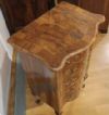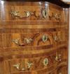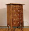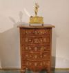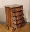 Elegante piccola cassettiera in radica e massello di noce intagliato e lastronato, caratterizzata da gambe curve e un fronte mosso che conferiscono un tocco di raffinatezza. La cassettiera è dotata di cinque cassetti ergonomici, ideali per riporre oggetti, completi di maniglie e bocchette in bronzo dorato. I cassetti, così come il bordo del piano, sono rifiniti con listelli in radica di noce, che aggiungono ulteriore eleganza. Questo bel mobile, in perfetto stato di conservazione, è in grado di arredare con gusto e classe qualsiasi ambiente. Manifattura italiana, di gusto francese, della prima metà del XIX secolo.