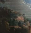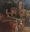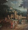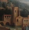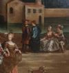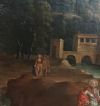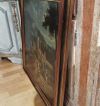 Raffinato dipinto a olio su tela, incorniciato da una cornice di legno intagliato dorato ed ebanizzato. Il dipinto raffigura un paesaggio collinare con un bosco, al cui interno si intravedono architetture e figure. Al centro si trova un mulino, circondato dall’acqua, con alberi e altre figure disposte attorno. In primo piano appaiono due personaggi, uomo e donna, intenti in una passeggiata, vestiti con abiti d’epoca di raffinata fattura, e accanto a loro due cani. Dietro di loro, sulla destra, un gruppo di giovani impegnati in una chiacchierata; sulla sinistra, più in lontananza, si scorgono altre due figure, uomo e donna, anch’essi vestiti con austerità elegante. Nell’opera l’artista padroneggia la tecnica del chiaroscuro e una pittura di stile realistico. Si tratta di un dipinto pregevole, in grado di arredare con gusto e raffinatezza qualsiasi ambiente. Manifattura francese della fine del XVIII secolo.