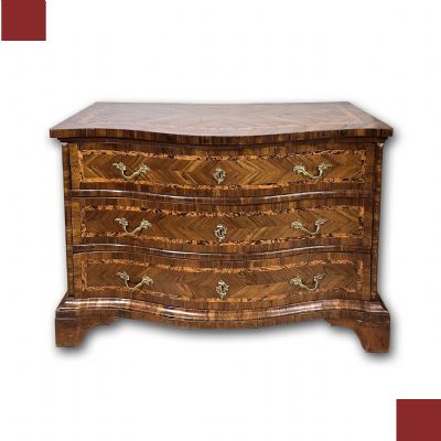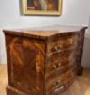 Bellissimo e raffinato cassettone veneto, caratterizzato da un fronte mosso e lastronato in radica di noce e radica di acero. Presenta un basamento lineare a mensola che conferisce al mobile una grande stabilità. Questo cassettone è inoltre estremamente pratico ed ergonomico, grazie alla presenza di tre ampi cassetti che consentono di organizzare facilmente gli oggetti al loro interno. Le cerniere e le maniglie in bronzo fuso a cera persa, e successivamente dorato, donano un tocco di eleganza e preziosità al mobile. La lavorazione artigianale veneta di questo cassettone può essere attribuita alla prima metà del XVIII secolo, intorno al 1740. La perfetta eleganza di questo mobile lo rende un'ottima aggiunta per arricchire e conferire un tocco di raffinatezza ad ogni ambiente.