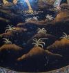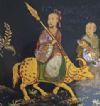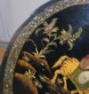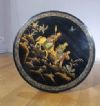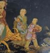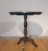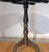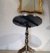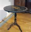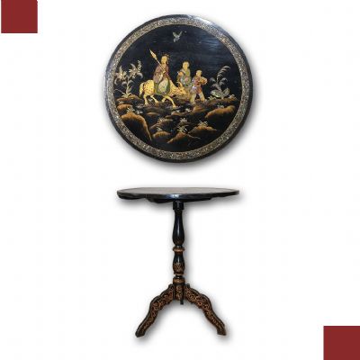 Elegante tavolino da appoggio in legno intagliato ed ebanizzato, caratterizzato da un raffinato stile orientale. Il fusto e le gambe a tre piedi presentano modanature elaborate, ed i piedi sono inoltre adornati con una delicata decorazione pittorica dorata a motivi fitomorfi. Il piano del tavolino si distingue per la sua sofisticata eleganza, con una fascia di contorno impreziosita da tarsie in madreperla. Al centro, una scena figurata orientale è dipinta con maestria e arricchita da ulteriori tarsie in madreperla. In questo paesaggio floreale, si trovano tre figure, di cui una figura principale seduta su un bue, impugnando uno scettro, affiancata da due personaggi più piccoli, probabilmente parte del suo seguito, i quali portano degli oggetti. La squisita decorazione di questo tavolino ne fa un pezzo di notevole valore ed eleganza, capace di arricchire con classe qualsiasi ambiente. Manifattura francese, in stile orientale, dei primi del XIX secolo (1820 ca.).