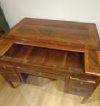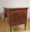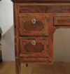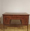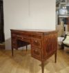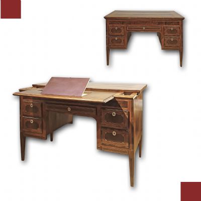 Raffinato scrittoio interamente lastronato in noce e palissandro, impreziosito da radica di noce e intarsi realizzati anche con legni di frutto. Lo scrittoio presenta gambe troncopiramidali, caratteristiche del periodo, e un piano scorrevole verso il retro. In questo modo, il mobile risulta comodo per la seduta, senza essere necessariamente inserita all’interno dello spazio del mobile stesso; aprendolo, si scopre il piano per scrivere, dotato di un leggio rivestito in pelle rossa. Quest’ultimo è anch’esso scorrevole, sia al centro che ai lati, rivelando quattro cassetti segreti ideali per riporre oggetti. Il mobile è inoltre dotato di cinque cassetti sul fronte ed è a giorno, poiché anche sul retro si può ammirare la maestria degli intarsi. Questi ultimi sono di grande raffinatezza, realizzati in motivi geometrici e nella classica forma a ventaglio sugli spigoli, conferendo un’eleganza superiore. Si tratta di un mobile di grande gusto e raffinatezza, capace di aggiungere un tocco di classe e di antichità a qualsiasi ambiente. Manifattura del centro-Italia del periodo Luigi XVI, intorno alla fine del XVIII secolo.