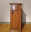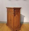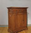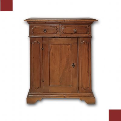 Elegante e raffinata credenza in massello di noce biondo, finemente intagliata. Questo pezzo d'arredo, dalle dimensioni contenute, è dotato di uno sportello e due pratici cassetti frontali, ideali per riporre oggetti con comodità. I piedi a mensola garantiscono una solida costruzione, mentre i delicati intagli geometrici presenti sul fronte e sui lati conferiscono un ulteriore tocco di classe. Questa credenza è perfetta per arricchire con gusto e stile qualsiasi ambiente. Manifattura toscana dei primi del XVII secolo.