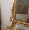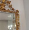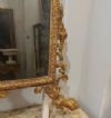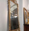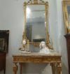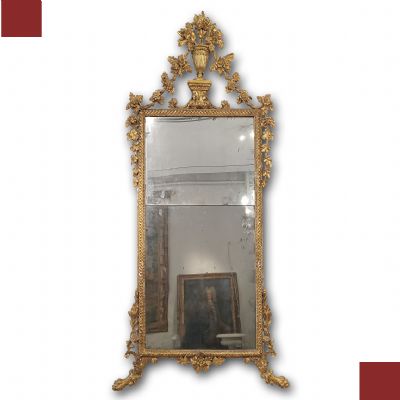 Elegante e imponente specchiera con cornice in legno di cirmolo, finemente intagliata e dorata con foglia d’oro zecchino. La cornice è adornata da sofisticati guilloches e perline, mentre la parte inferiore termina con gambe ferine e decorazioni vegetali. Anche la cimasa si distingue per la sua ricchezza ed eleganza, caratterizzata da ghirlande vegetali e un vaso centrale adornato di fiori. Gli specchi, originali dell’epoca, sono contemporanei alla cornice stessa. Questa specchiera “da palazzo” è di notevoli dimensioni e si presenta come un mobile di grande eleganza e raffinatezza, capace di arricchire con gusto e classe qualsiasi ambiente. Manifattura lucchese (toscana) del periodo Neoclassico, seconda metà del XVIII secolo.