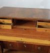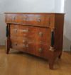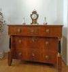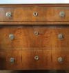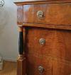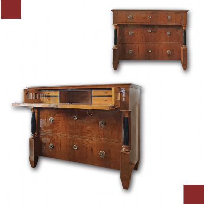 Elegante cassettone con scrittoio a calatoia, lastronato in pregiato legno di noce. Il cassettone presenta gambe troncopiramidali, tipiche della fine del XVIII secolo, mentre l’esterno e le colonne riflettono lo stile e il periodo dell’Impero degli inizi del XIX secolo. Il fronte è decorato da due colonne ebanizzate e composto da tre cassetti, dotati di maniglie in bronzo fuso a cera persa. Gli ultimi due cassetti sono ergonomici, ideali per riporre oggetti, mentre il primo cassetto si apre come scrittoio, grazie ad una cerniera che fa calare il piano, e presenta ulteriori piccoli scomparti in legno chiaro e un piano di lavoro rivestito in pelle. Questo bellissimo cassettone è in grado di arredare con raffinatezza ed eleganza qualsiasi ambiente. Manifattura italiana del periodo impero, tra le fine del XVIII e gli inizi del XIX secolo.