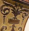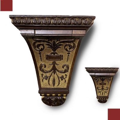 Elegant pair of solid walnut shelves, carved and highlighted with pure gold leaf. The decoration features a typically architectural style, with a frame adorned with floral buds and, in the center, intricate vegetal volutes that stand out against a golden background, and a tabula ansata. These unique and refined shelves are capable of lending a touch of class and sophistication to any environment. Typical craftsmanship of the period when Florence was the capital of Italy, in the second half of the 19th century, between 1865 and 1871.