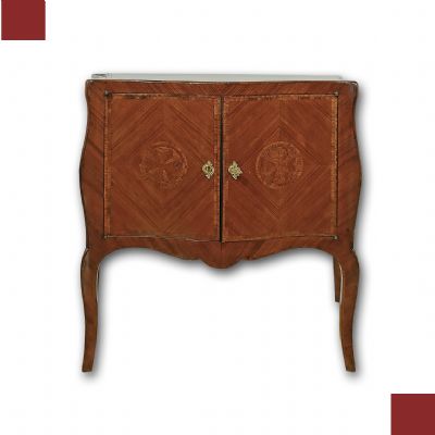 Elegant small sideboard in poplar wood, hand-carved and veneered in rosewood. The curved front and sides add a touch of refinement to the piece of furniture, enriched by semicircular legs. To further enhance its elegance, there are inlays in fruitwood, with compass rose geometric decorations on both the top and the front of the doors. The sideboard has two doors, openable with a key and gilded bronze locks, which conceal two ergonomic shelves. Beautifully crafted, elegant and refined, this sideboard is able to furnish any environment with taste and class. Neapolitan craftsmanship from the mid-18th century. Measurements: H x W x D 86.5 x 90 x 43.5cm