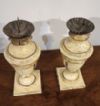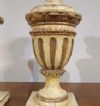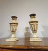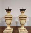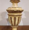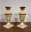 Elegante coppia di candelabri in legno di cirmolo intagliato e laccato color avorio, impreziositi da rifiniture dorate in oro zecchino. I candelabri presentano una pianta quadrata e una forma ad anfora liscia, esaltata da dettagli raffinati. Le decorazioni dorate conferiscono un tocco di classe e di eleganza superiore. Questa coppia di portacandele è versatile, adatta sia per l'uso come candelabri che come porta lampade; è possibile elettrificarli e impiegarli come abat-jour, rendendoli complementi decorativi di grande pregio e funzionalità. Manifattura toscana (centro-Italia) del periodo neoclassico, intorno alla seconda metà del XVIII secolo.