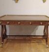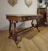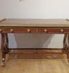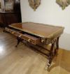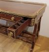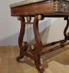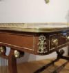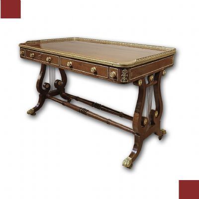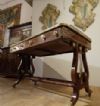 Bellissimo ed elegante scrittoio da centro, con lastronatura di alta qualità in legni di noce e palissandro, ed impreziosito da decorazioni in bronzo fuso a cera persa. Lo scrittoio si distingue per le sue gambe a lira, unite da parti tornite e decorate con dettagli floreali in bronzo dorato, con gambe che terminano in zampe ferine anch’esse in bronzo dorato, dotate di rotelle utili per facilitare lo spostamento. Il piano presenta una fascia ad intarsio ed una balaustra anch’essa in bronzo dorato, finemente cesellata, che conferiscono ulteriore eleganza. Nella fascia del sottopiano si trovano tre cassetti apribili con maniglie in bronzo dorato: due di medie dimensioni e uno particolare più piccolo, posizionato vicino all’angolo di destra, funzionale per penne e calamai. Si tratta di uno scrittoio di grande gusto e raffinatezza, capace di arredare con classe ed eleganza qualsiasi ambiente. Manifattura italiana, che richiama lo stile neoclassico degli ebanisti francesi, nel periodo Napoleone III, intorno alla metà del XIX secolo.
