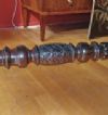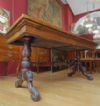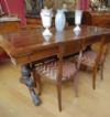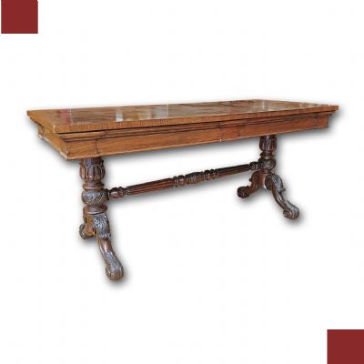 Elegante tavolo scrittoio in noce intagliato ed ebanizzato,con piano liscio e due cassetti sul fronte del sottopiano, pratici per riporreoggetti. Le gambe, in noce ebanizzato, sono costituite da due piedi e unatraversa, riccamente intagliate e modanate a decori geometrici e vegetali, tracui la foglia d’acanto. Si tratta di un tavolo di grande eleganza, capace diarredare con gusto e raffinatezza qualsiasi ambiente. Manifattura italiana, delperiodo Carlo X, intorno ai primi del XIX secolo.